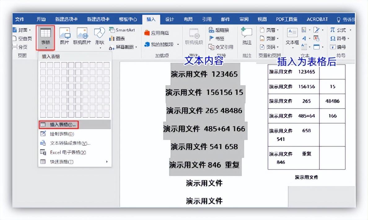 Word里面的数据还能转换成表格,将文本内容之间,用空格键分隔开,然后选中文字,点击工具栏的【插入】-【表格】-【插入表格】,就会自动转成表格。