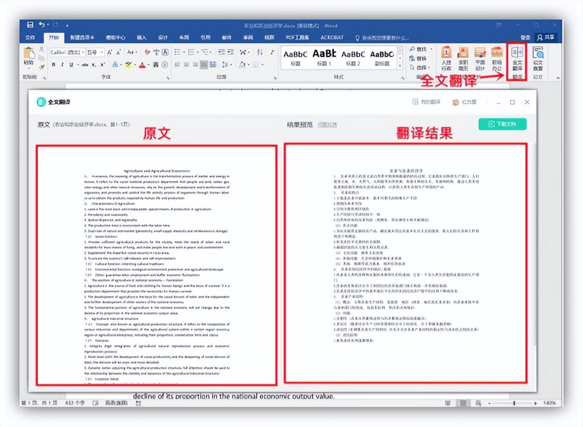 当我们在查阅外语文档时,无需借助第三方翻译工具,只要启用Word自带的翻译工具,就可以快速且准确的翻译文档内容。在【开始】菜单里找到【全文翻译】,点击直接翻译成中文。