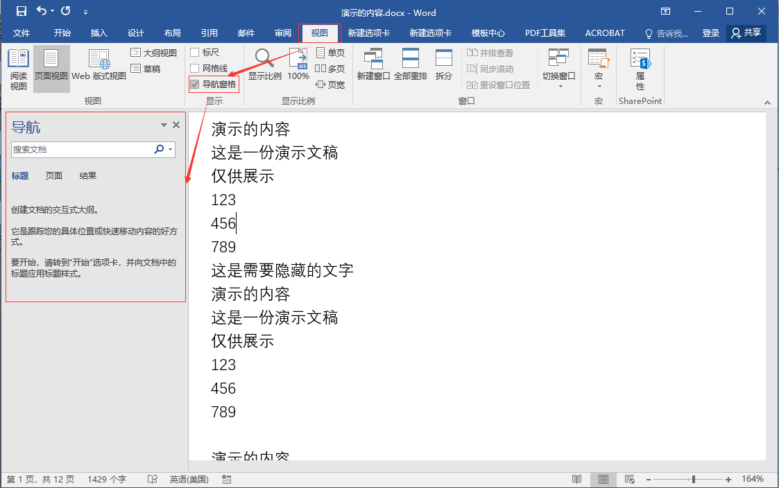 如果文件内容很多,我们可以在【视图】里勾选【导航窗格】,这样子就可以通过标题快速定位到想要查看的位置了。如果这篇Word没有设置标题,也可以输入关键词进行定位并跳转。