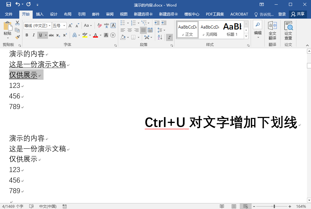 想为长篇段落划出重点,我们一般会选择增加下划线,在选中文字之后,按下【Ctrl+U】,就可以快速地为文字增加下划线。