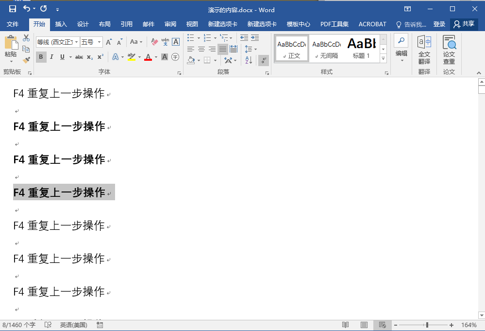 无论你上一步是什么操作,例如粘贴剪贴板内容,那么只要点击F4,就可以不断地粘贴这部分内容;如果你上一步是加粗选中字体,那么接下来选中其它文字,按下F4就可以直接加粗,不需要去点击加粗的按钮。
