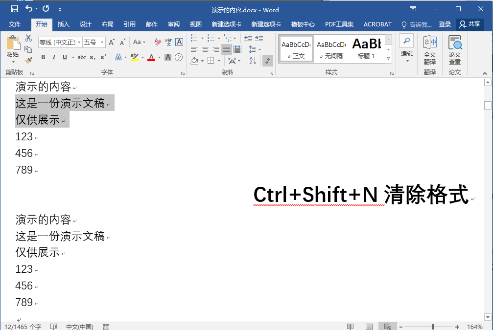 从其他地方复制的内容,粘贴之后总是带着其他格式,这个时候选中文字,按下【Ctrl+Shift+N】就可以快速清除文字带有的格式了