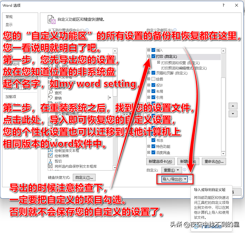 而且,属于我的这个“自定义功能区”的设置还可以导出备份,以便移植到其它word版本相同的计算机上,或者在重装word软件之后恢复。