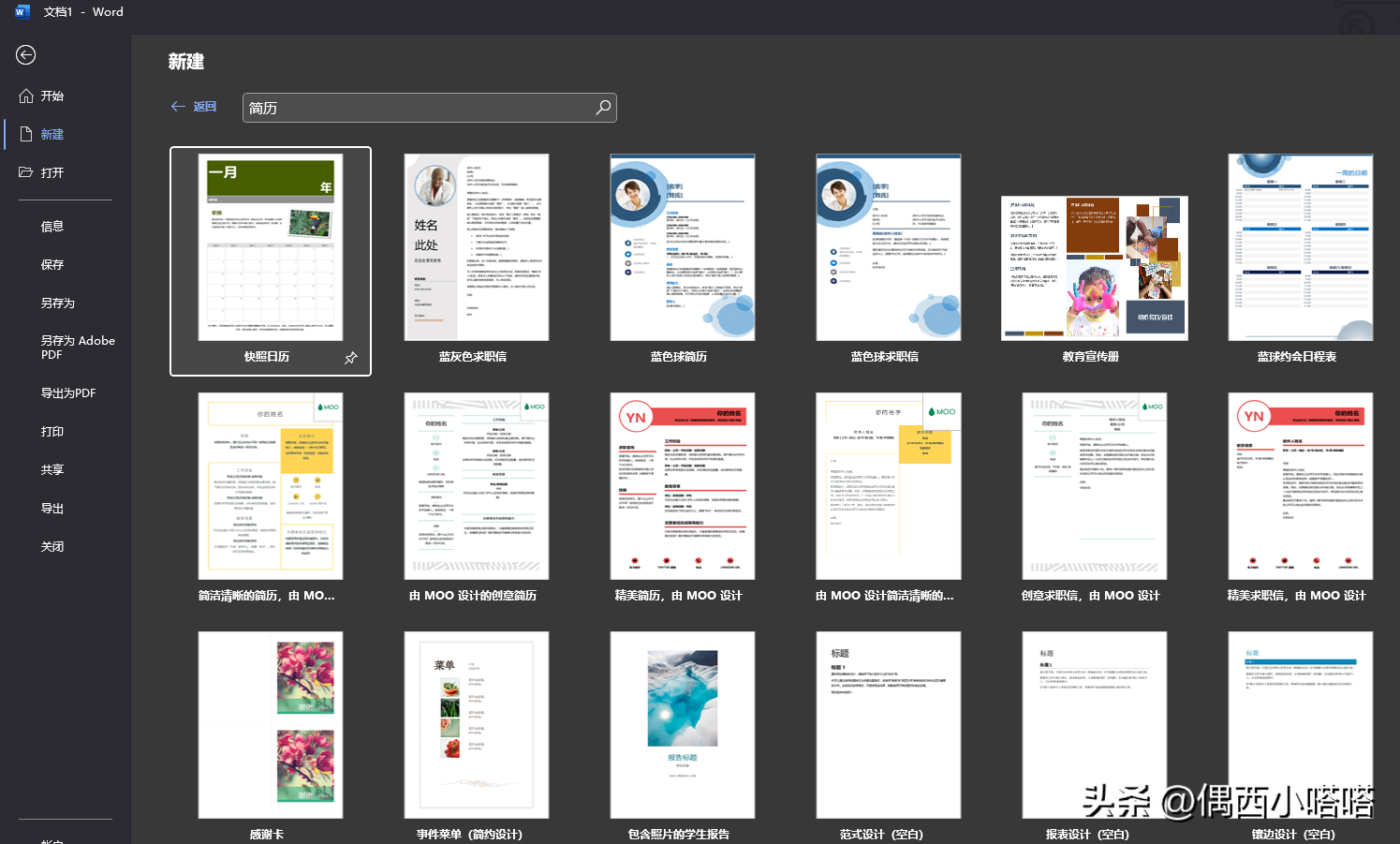虽然微软的界面清爽,的确没有金山WPS素材模板多,如上图所示,点击新建后,会看到搜索框,输入关键词,比如简历,即可看到更多相关在线模板: