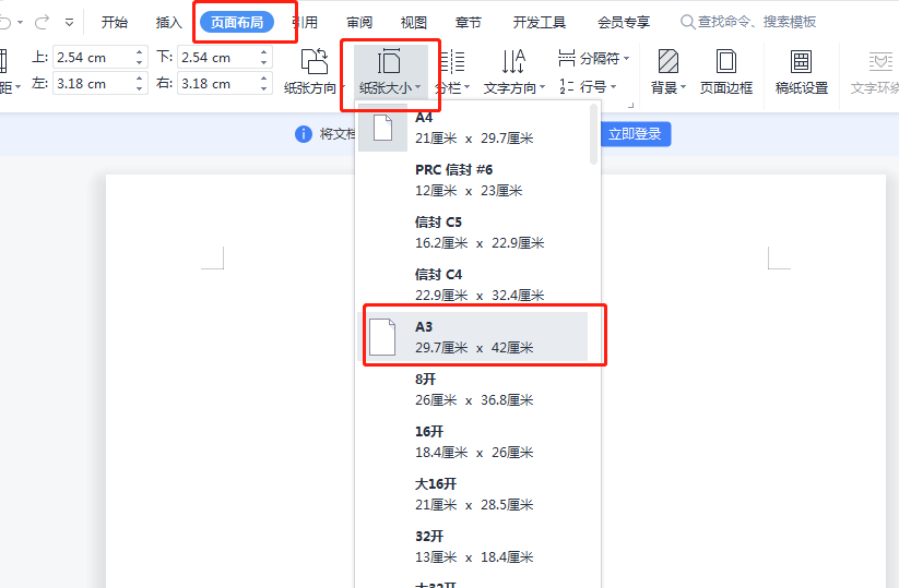 操作方法:在【页面布局】选项卡的功能区中选择【纸张大小】。在弹出的菜单中选择【A3】,即可完成尺寸的修改。