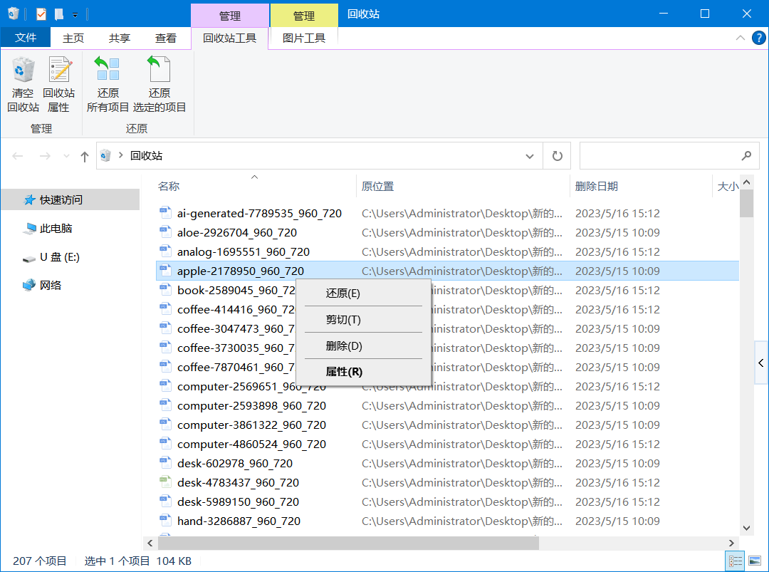 3、右键点击选中的文件,选择“还原”,即将文件还原至原来的路径。