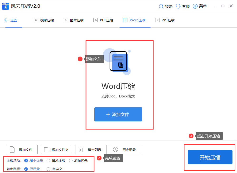 在电脑上打开软件,点击【Word压缩】,然后点击添加文件,将需要压缩的文档导入,接着我们可以进行设置,之后点击【开始压缩】,这样的话软件就会帮我们对Word文档的体积进行压缩了。
