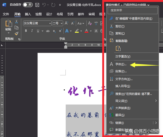 1、通用选择文字,在文字上点击鼠标右键,右键菜单即可看到中间位置的“字体”选项,我们点击即可: