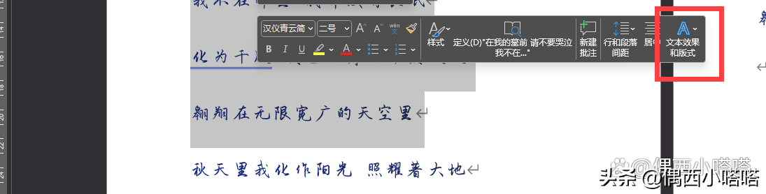 1、鼠标左键选择中需要修改颜色的字体,如下图1所示,在浮动的快捷功能上,最右侧可以看的最大的A图标就是文本效果和版式:
