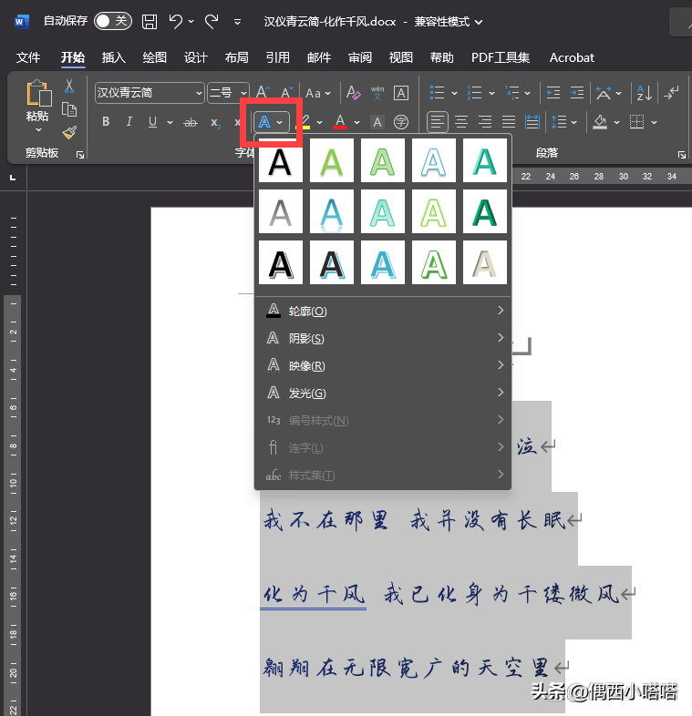 2、没有浮动快捷功能的小伙伴,可以在默认开始菜单,还是字体模块位置,找到蓝色的A图标,也是文本效果和版式功能,点击效果和上面浮动功能里的一样,会出现下拉样式,里面有很多内置的不同颜色。点击你喜欢或需要的即可: