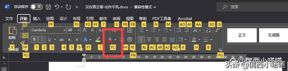 2、再点击H,你会发现alt键之后没有出现标签的功能按钮,也会显示出标签,如下图里选择文字颜色的功能按键,上面的快捷标签是FC,我们先点击F,再点击C: