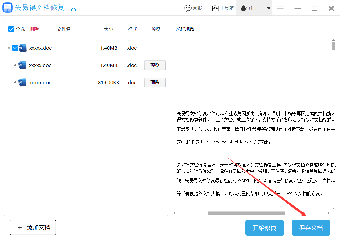 确认文档可以正常预览。点击右下角的“保存文档”按钮,将修复后的word文件保存到本地文件夹。