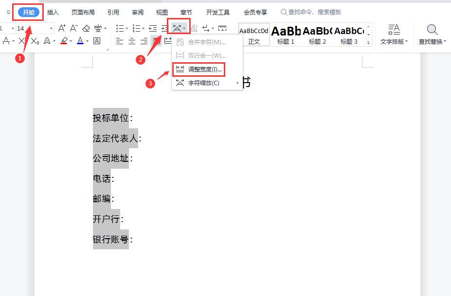 2、然后点击【开始】-点击【中文版式】下拉菜单-选择【调整宽度】,如下图所示