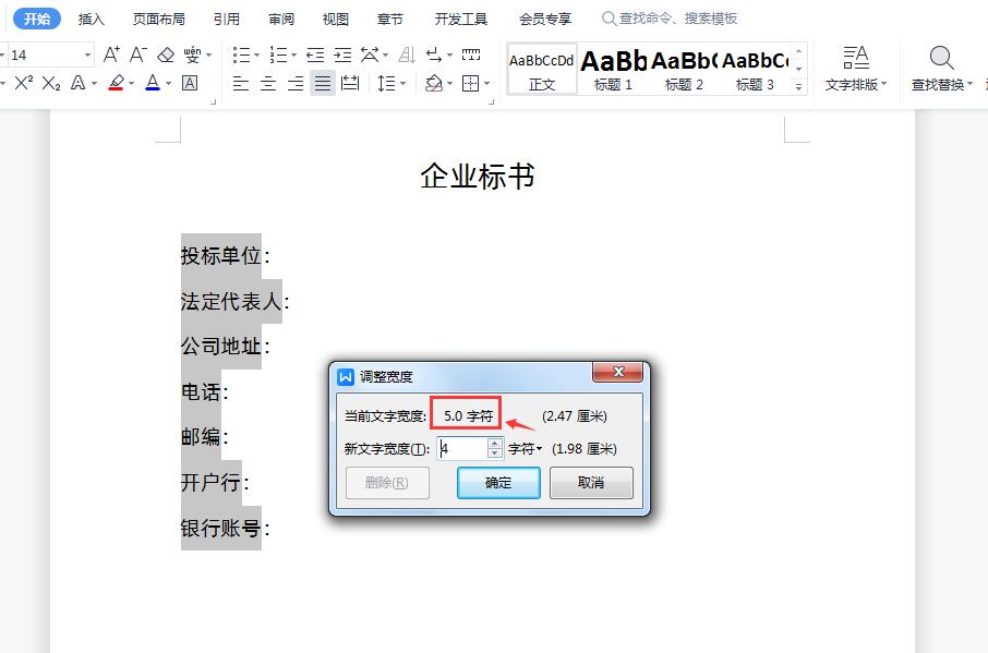 3、在弹出的“调整宽度”对话框中,【当前文字宽度】是几个字符,下面的【新文字宽度】就填写几个字符,最后点击确定。比如实例中“当前文字宽度”是5个字符,那么我们在“新文字宽度”就填写5字符就可以,最后确定,这样上下文字就对齐了,如下图所示