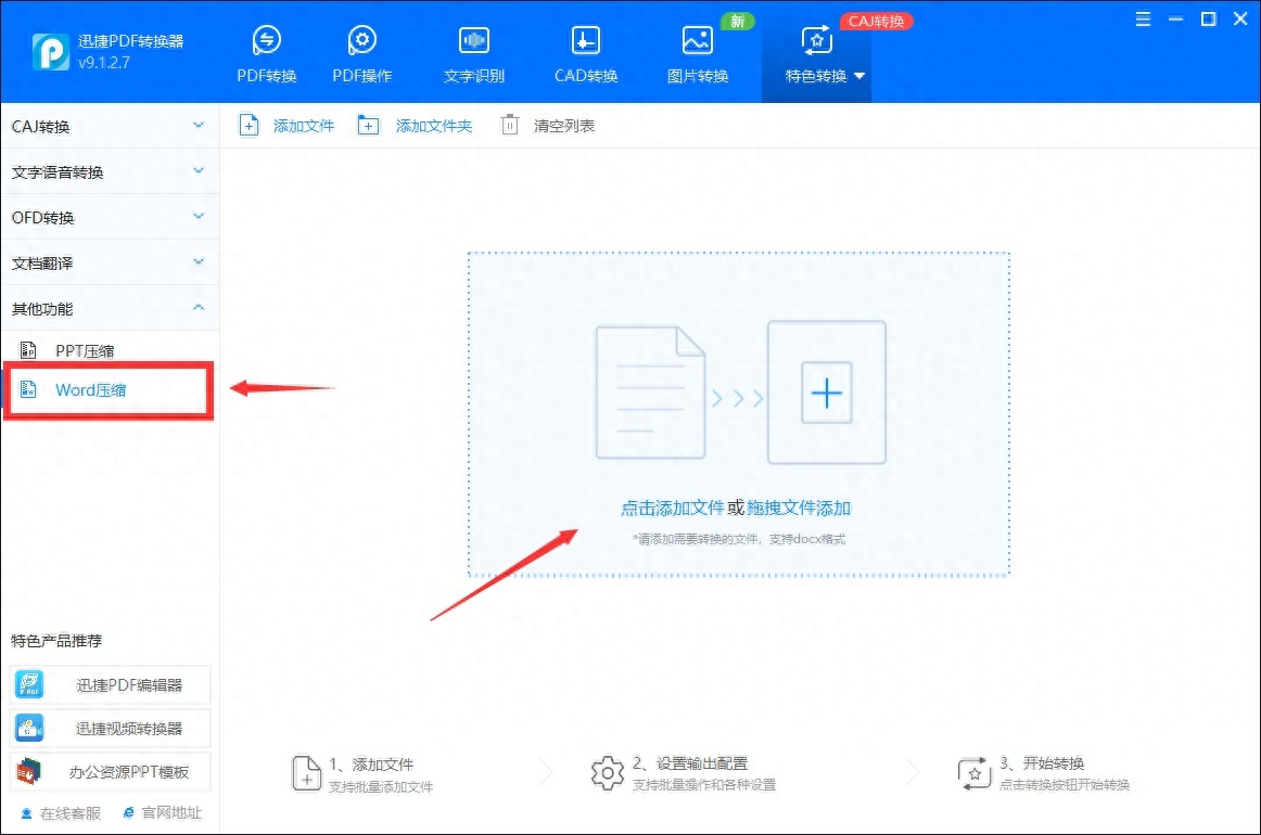 打开迅捷PDF转换器,点击页面上方选择“特色转换”,再点击左侧选择“Word压缩”,导入word格式文档;