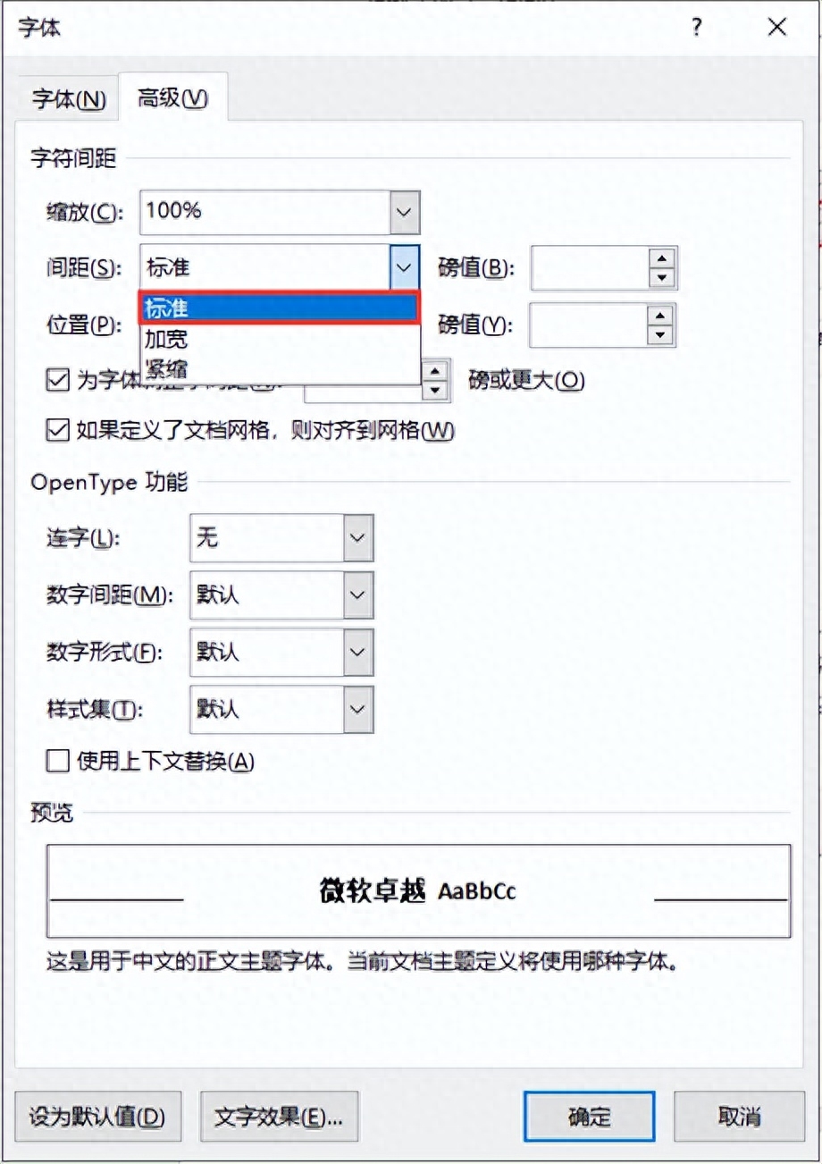 文档排版时,正文的字间距一般不需要设置,保持默认即可,如图所示。