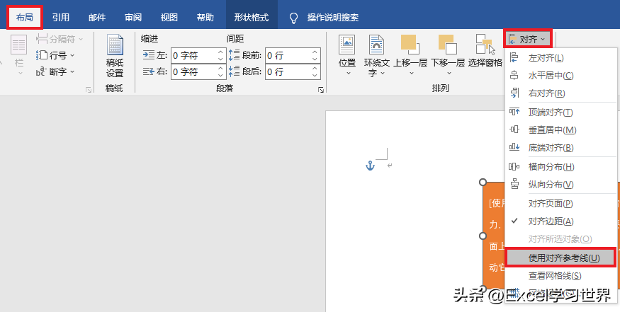 2. 选择菜单栏的“布局”-->“对齐”-->“使用对齐参考线”