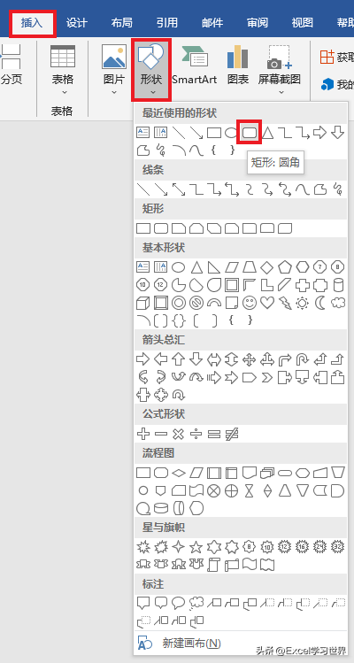 1. 选择菜单栏的“插入”-->“形状”--> 随便选一个形状