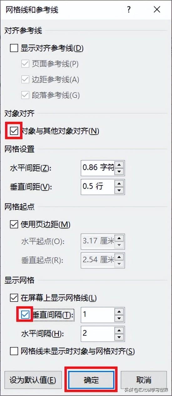 2. 在弹出的对话框中勾选“垂直间隔”和“对象与其他对象对齐”--> 点击“确定”