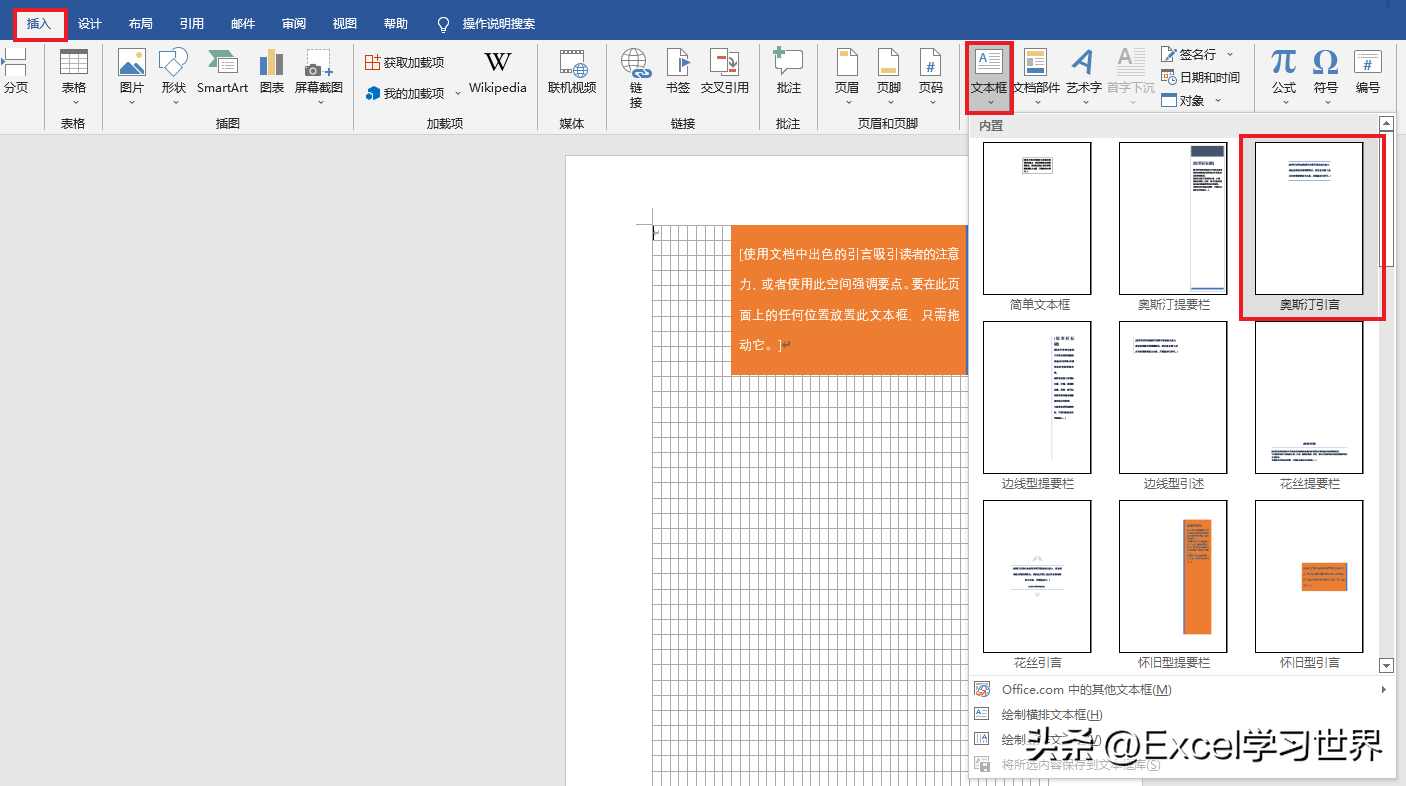 1. 打开一个空白的 Word,选择菜单栏的“插入”-->“文本框”--> 随便选择一个文本框