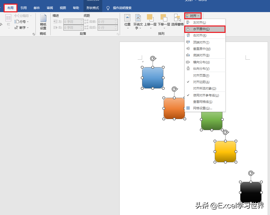 6. 选择菜单栏的“布局”-->“对齐”-->“水平居中”