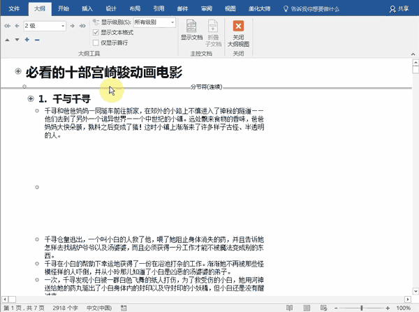 虽然知道 Office 都有视图选项卡,包含了各种浏览模式,但从没正经用过大纲视图。切换到大纲视图后,工具栏会多一个大纲选项卡,页面会变成这个样子: