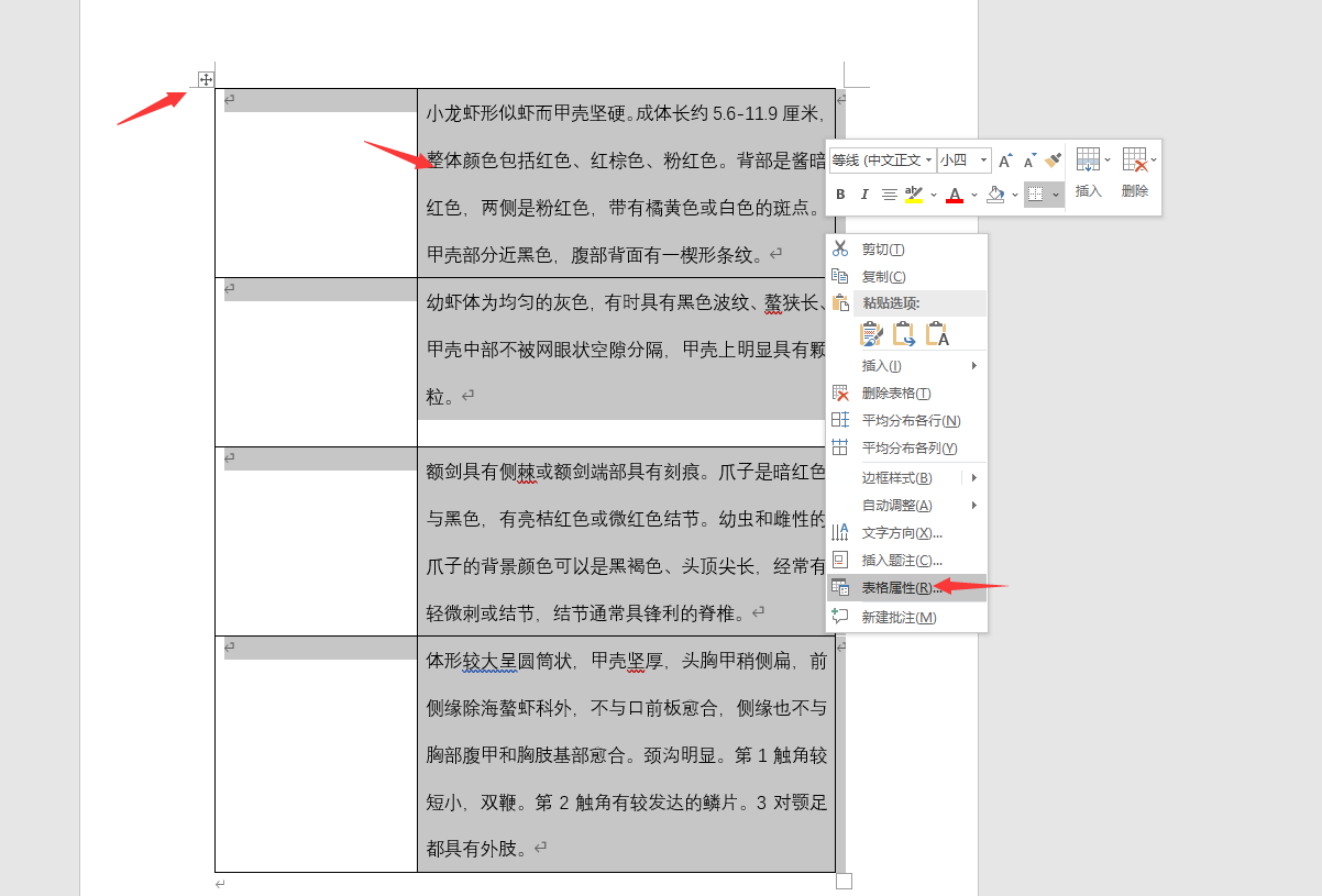 メ我们把文字部分复制进去,点击表格左上角全选表格,右键表格属性。メ
