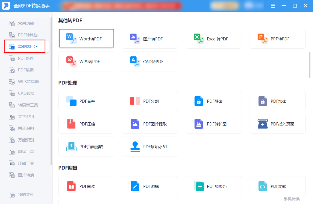 步骤一:打开软件,在首页选择【其他转PDF】,点击【Word转PDF】功能。