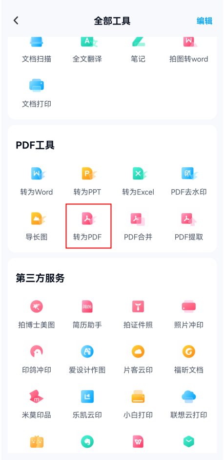 步骤一:安装APP后打开,在【全部工具】中找到【PDF工具】,点击【转为PDF】。
