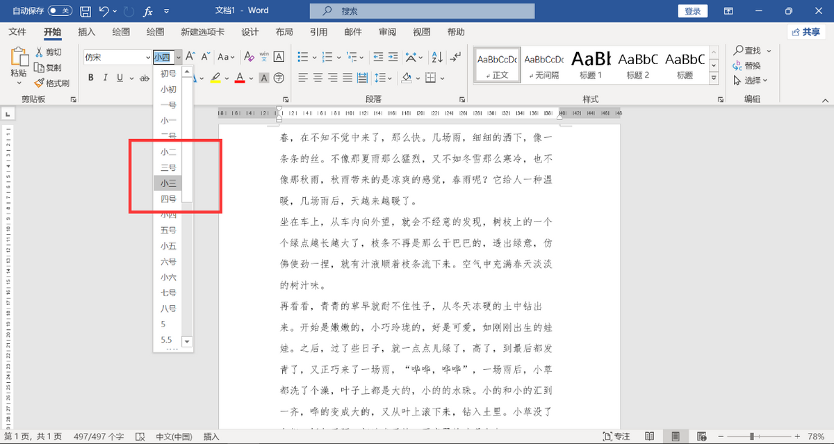 全选文字,点击菜单栏上“开始-字号“,下拉选择数字,设置字体的大小。