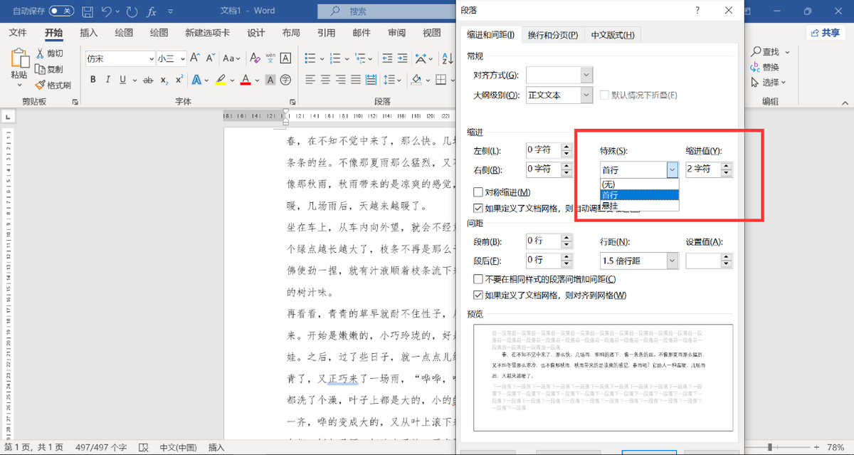 点击“特殊”,下拉选择“首行”,缩进值输入框里输入2字符。