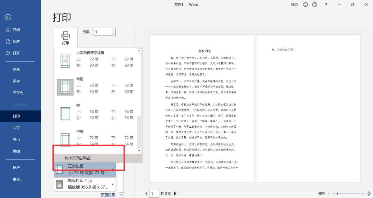 点击菜单栏上“文件-打印”,或是“CTRL+S”快捷键进入打印预览界面,预览效果显示不理想,需要调整页边距。