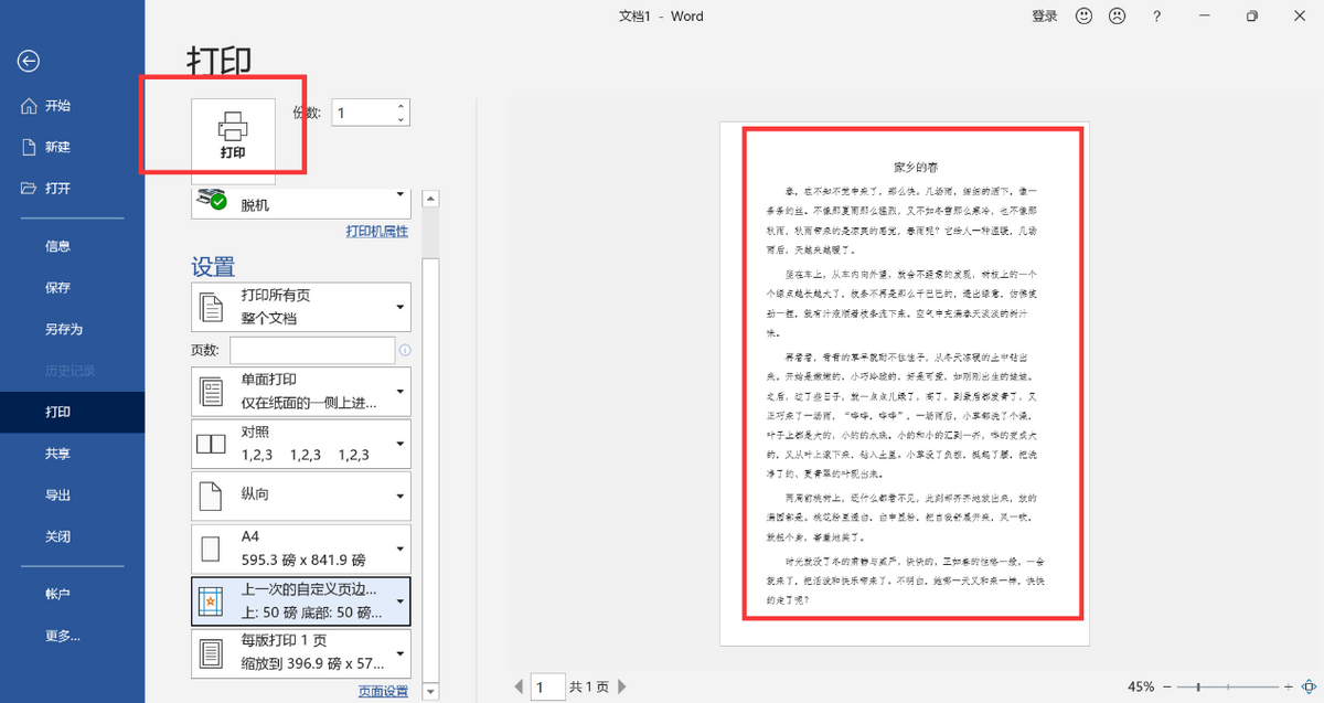 透过预览框查看无误后,选择打印机,点击打印按钮即可打印文件。