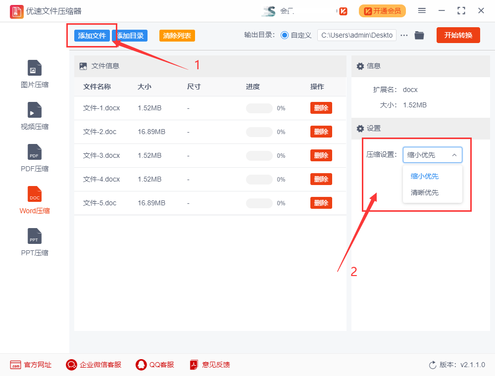步骤2,点击【添加文件】蓝色按钮,将需要压缩的word文件添加到软件中,软件支持批量压缩,所以可以同时添加多个word文件。然后进行压缩设置,选择压缩方式(缩小优先或者清晰优先)。