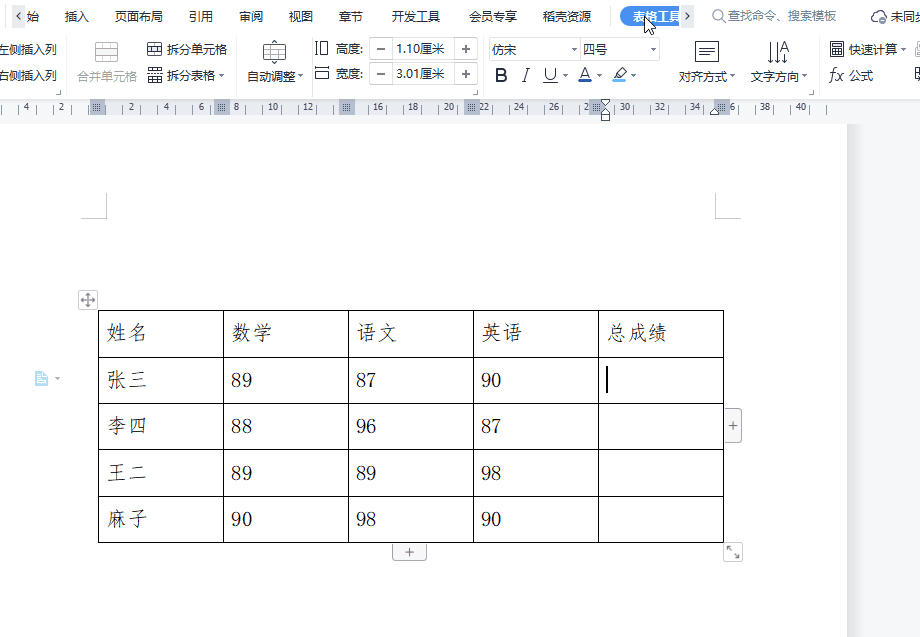 Word中的表格计算公式是不能Excel中那样通过拖拉的方式来实现快速复制的,但是同样可以通过F4来实现,只需先对第一行的结果进行计算,其他行计算只需按F4即可自动计算出来。