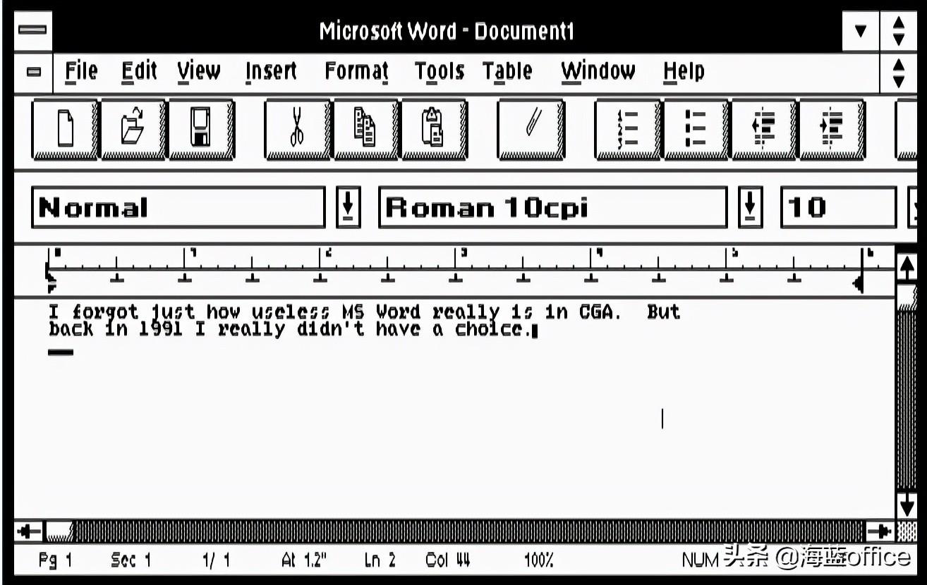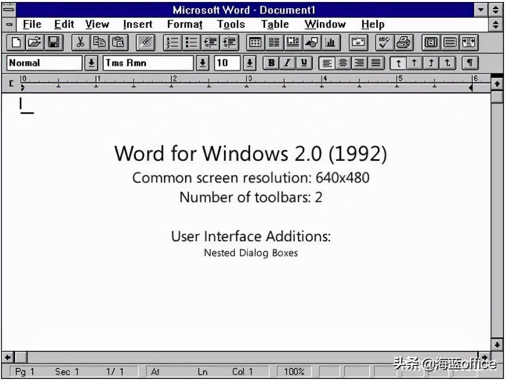 根据文献记载,Word 2.0算是最早、真正意义上的Windows版本。就其界面来看,这是一个具有文本输入、字体/字号设置、剪切复制、项目符号等常用功能的文本编辑软件。尽管看起来不是那么美观,不过已经有了今天Word该有的样子。