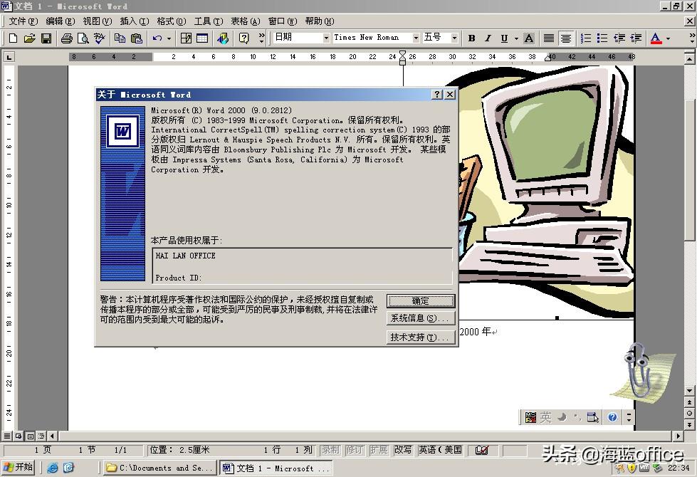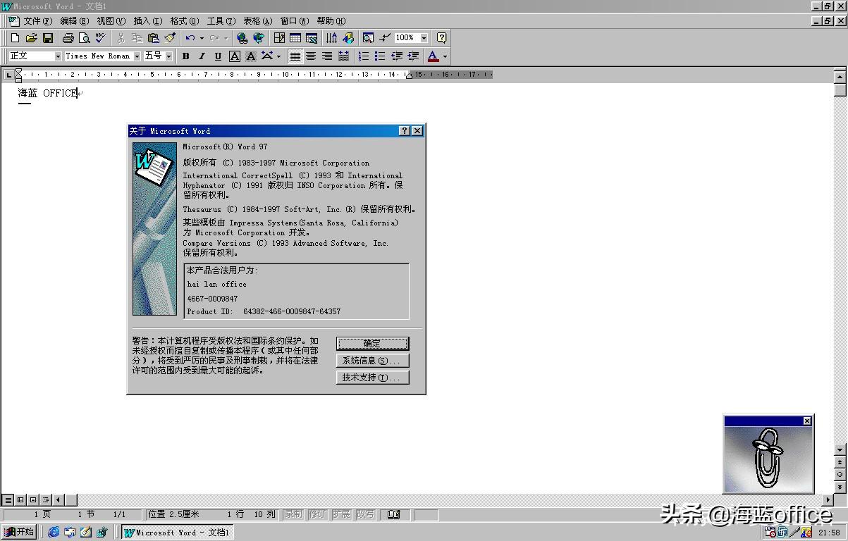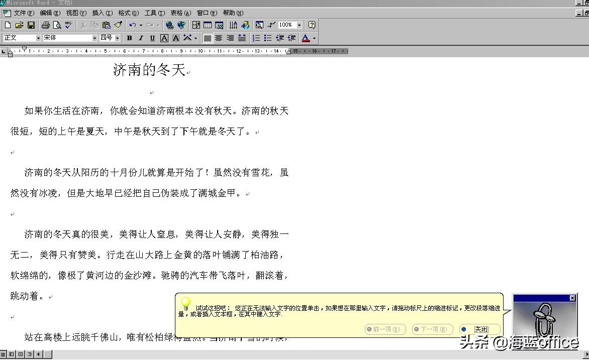 安装好这一个版本的Word,你会发现在桌面右下角多了一个动画小人“小别针”。时不时的跳出来给你指导这个软件应该如何使用。这可能就是最早的“人工智能”吧。好用不好用先别说,动不动的跳出来,挺烦的。