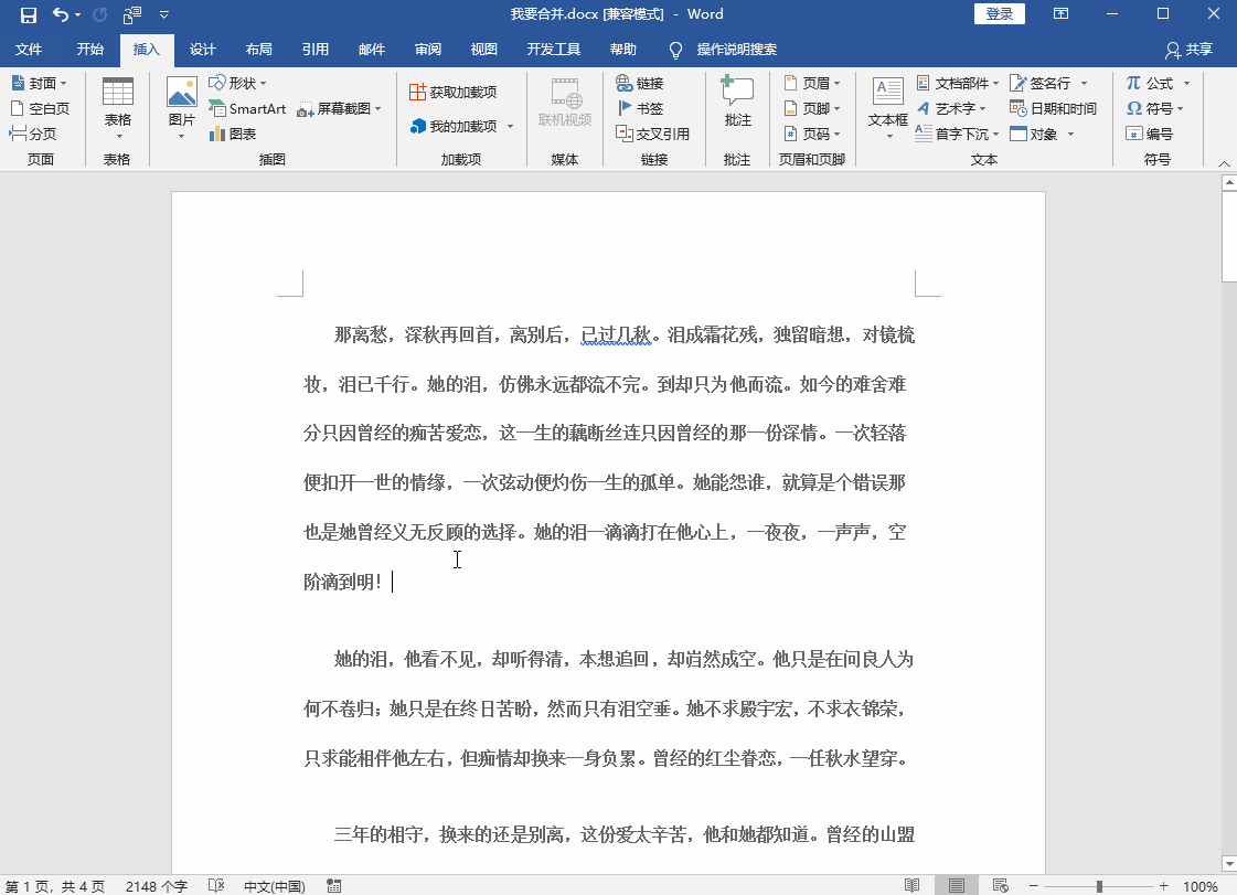现在就已经把Word合并了,注意左下角有4页内容。试想一下,如果你需要合并300份Word文档,是不是只要10秒就能轻松搞定!