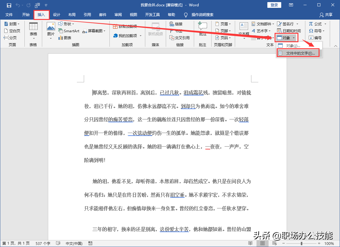 文件夹中有大量的Word文件,我们打开其中的一份Word,然后点击【插入】选项卡,在文本栏目中选择【对象】-【文件中的文字】。