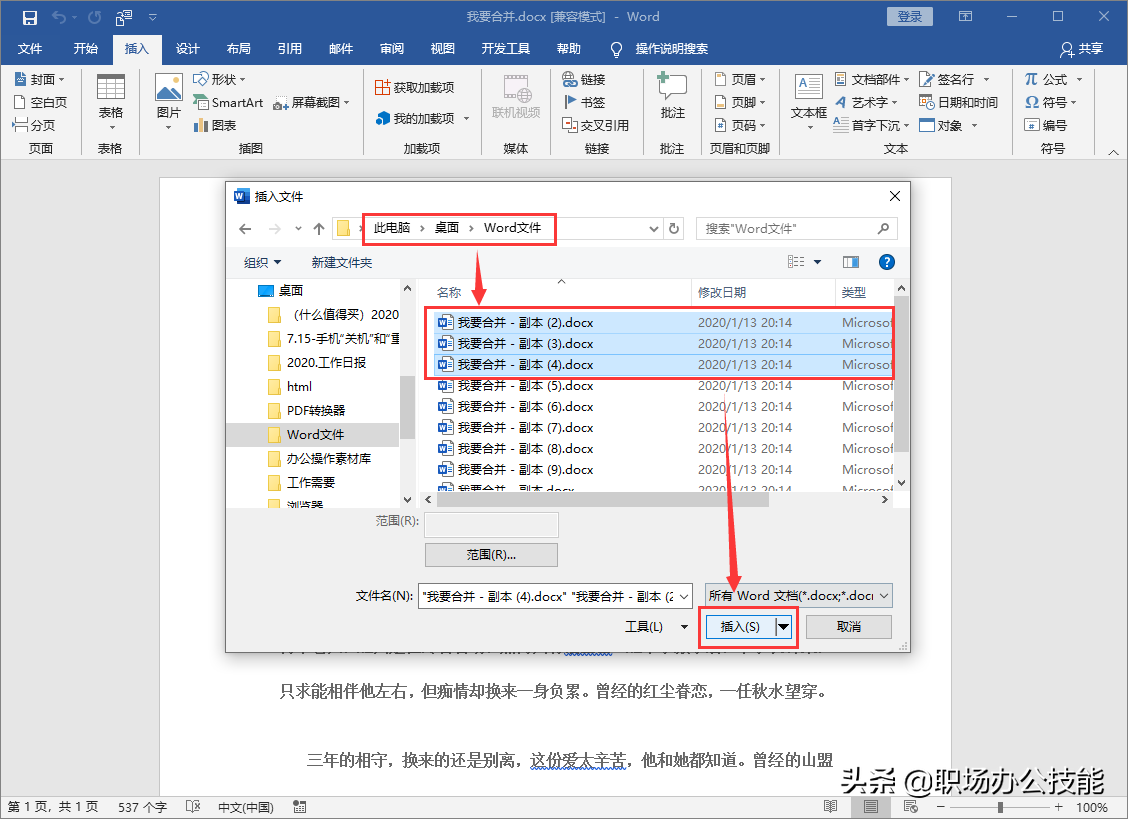随后将会打开电脑上的文件路径,找到Word文件夹,打开后批量选中Word文件,这里我任意选择3个,然后点击【插入】即可。