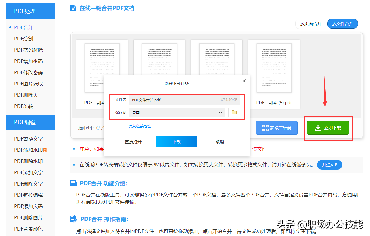等待PDF文件合并完成,点击【立即下载】按钮,将文件保存到桌面,最后我们将会得到一份合并的PDF文件。
