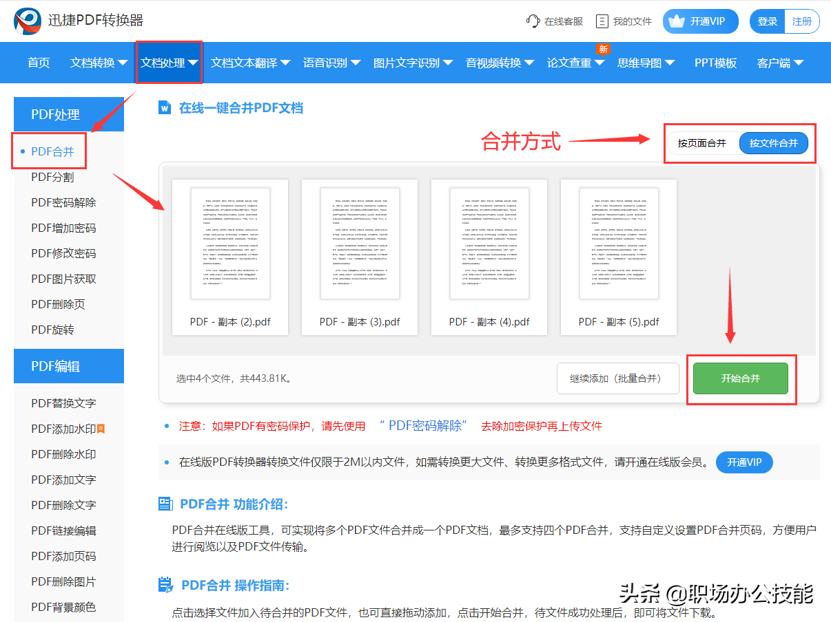 1.打开这个在线工具,点击【文档处理】-【PDF合并】;