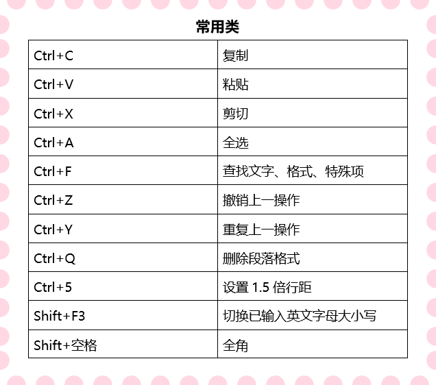 这是一些我们的Word中很经常会使用到的快捷键,不管是保存文件,撤销操作还是复制粘贴等等的操作,我们都可以用以下这些快捷键快速完成这些常用操作。