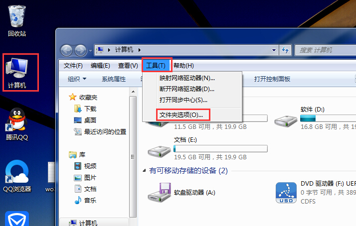 1、依次打开“计算机-工具-文件夹选项--查看”,如图所示: