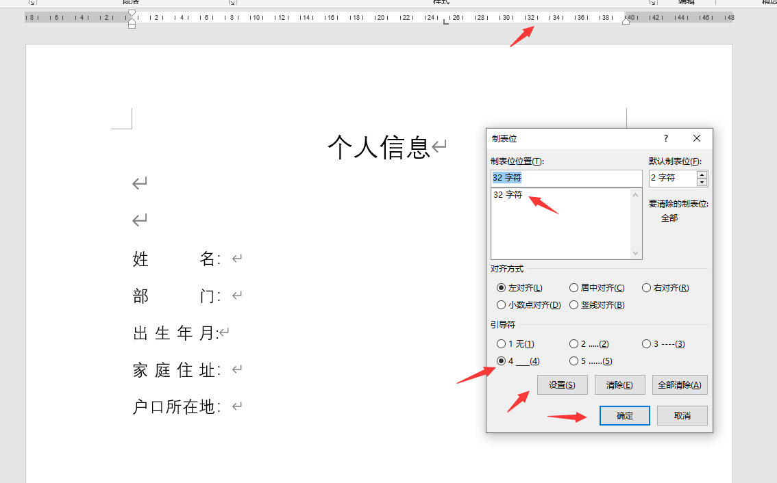 メ我们观察一下标尺,确定下划线合适的长度,输入32字符,点击设置,再选择引导符4,点击确定。メ