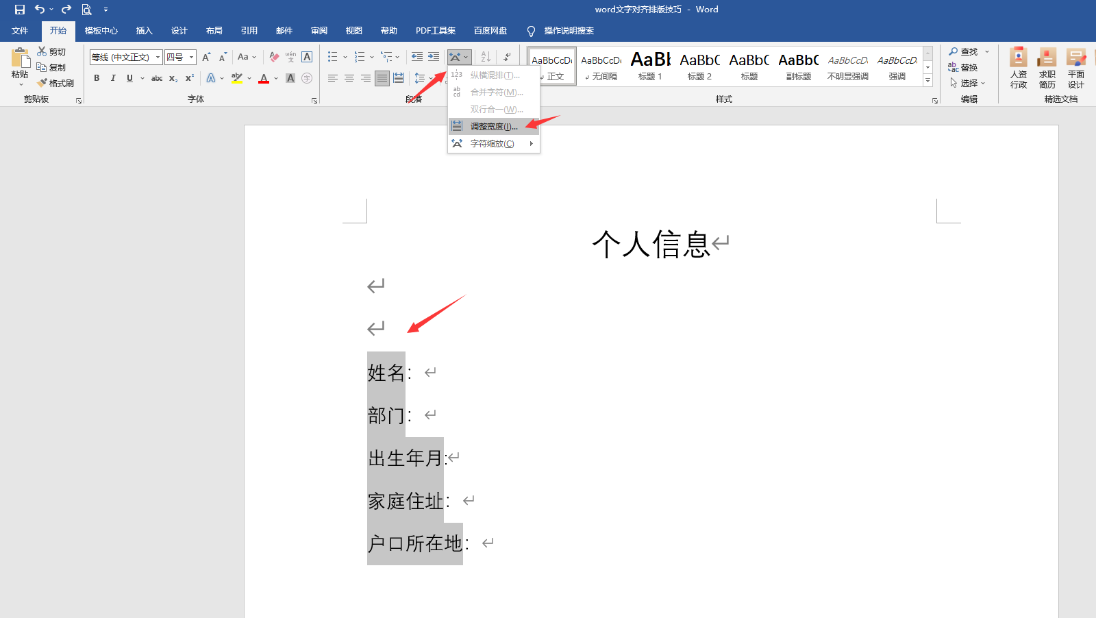 メ找到开始菜单栏——中文版式——调整宽度。メ