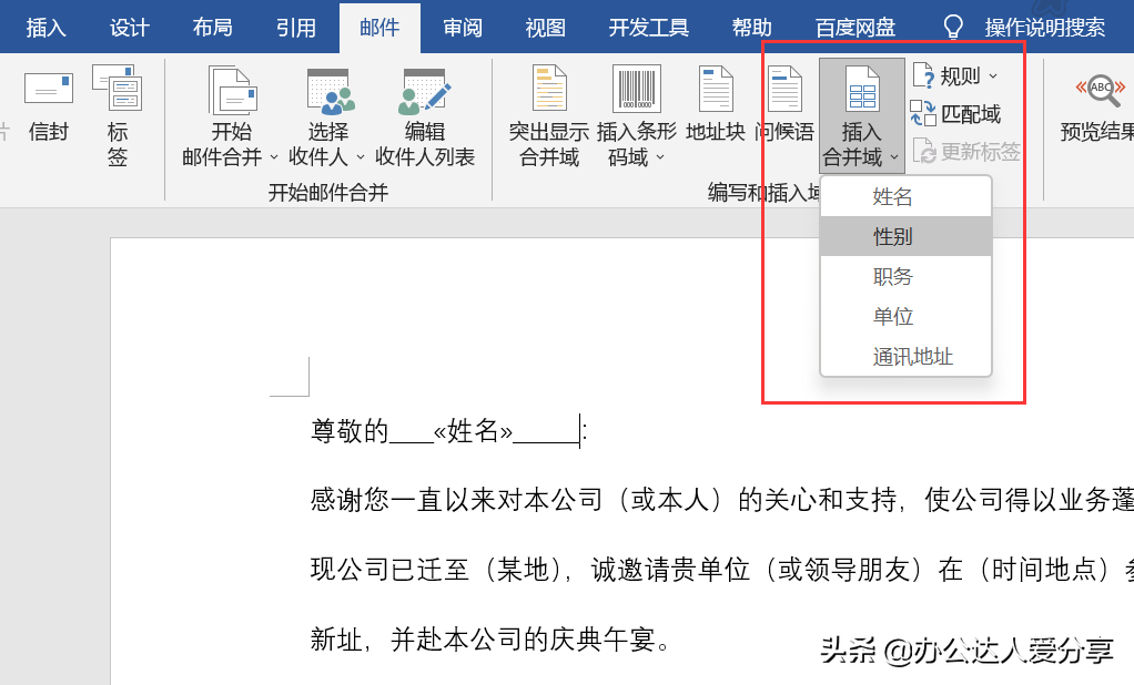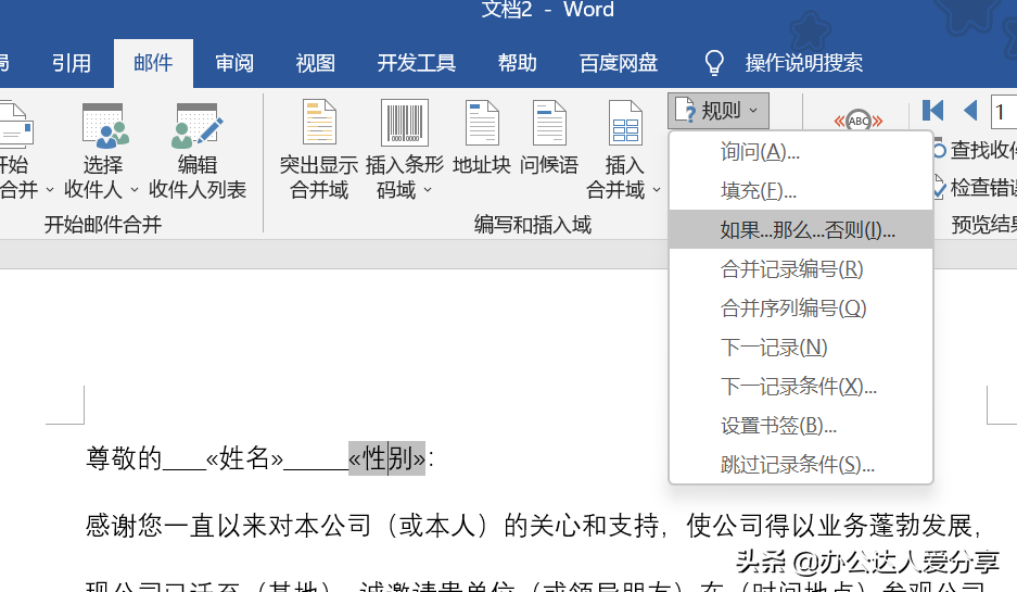 当使用Word的邮件合并功能批量生成邀请函时,我们需要通过对性别男女判断,智能的在嘉宾名称后方添加【先生/女士】的尊称,这是如何操作呢?