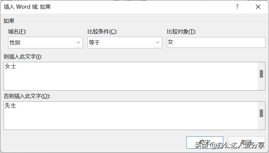 当我们插入【性别】时,可以利用Word实现智能的判断,在【姓名域】后面加一个规则【如果…那么…否则…】。