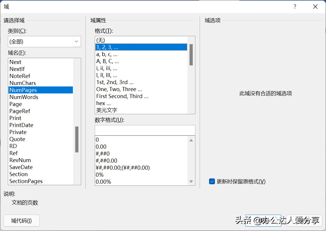 还有一种方式,可以直接编辑页码,输入内容,如“第几页”,然后点击【文档部件】-【域】-【NumPage】-【1,2,3……】-【确定】,同样可以完成页码自动更新。