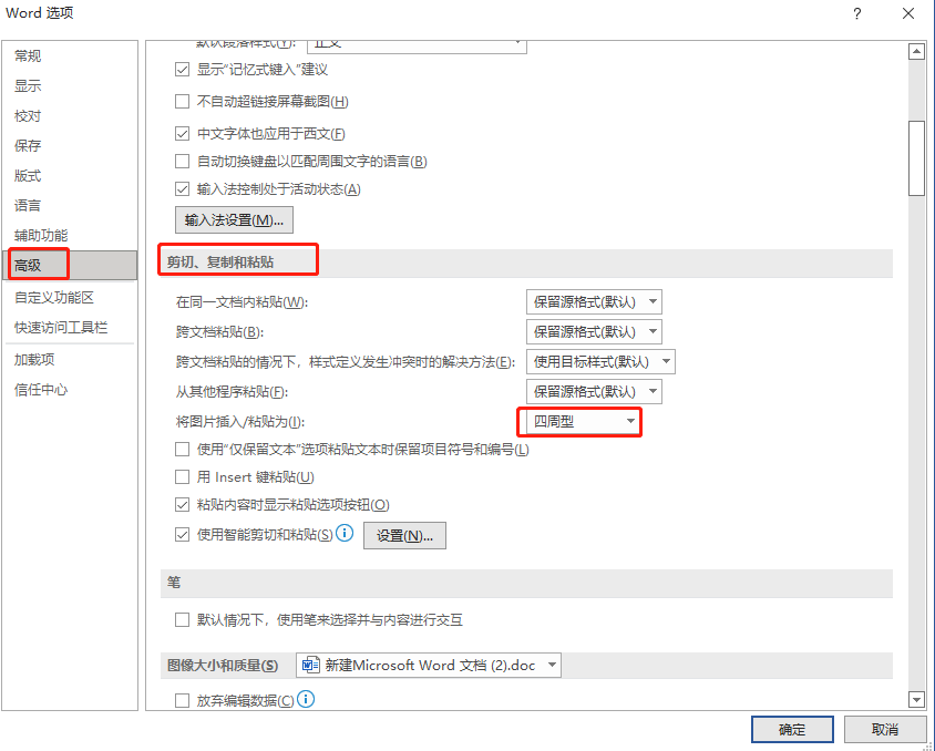 1.首先打开Word文档,点击【文件】-【选项】-【高级】,找到“将图片插入/粘贴为”,选择【四周型】。(PS:图片要求为非嵌入式的任何一种环绕方式都可以)
